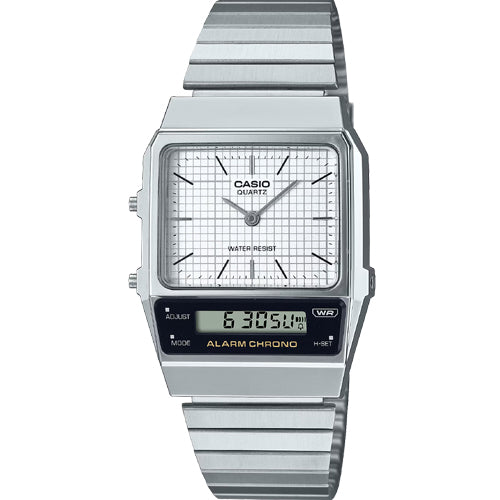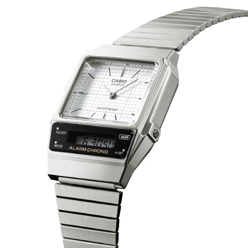 Reboot your retro vintage style with a contemporary update on the 1980s AQ-450 design. This brand-new vintage style watch is a beautiful blend of retro and stylish. A separate dial and LCD serve up analog beauty alongside digital performance. The LCD angles gently to follow the lines of the lugs, while the analog dial features simple bar index marks. The watch face adorned in a grid pattern adds the final touch for a real retro feel. The combination of the angular case and the straight links of the metal band is a simple and stylish celebration of structural beauty. More than just a fashion statement, these timepieces deliver practical functions like dual time, stopwatch, and alarm, as well as water resistance for daily use to free you from worry, even on rainy days.