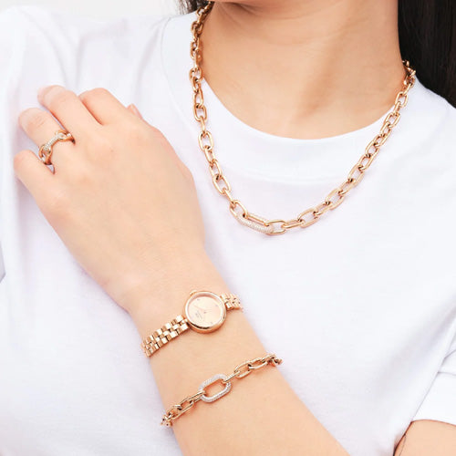 The first crossover between our jewelry and watch collections, Elan Lumine shares the same delicate silhouette and logo design details as its namesake pieces. Features a 3-link strap and crystals dotting the rose gold unitone dial.