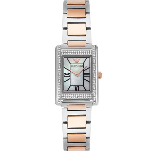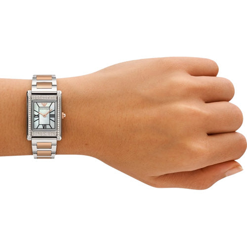 Emporio Armani's 22mm x 32mm watch features a mother-of-pearl dial, two-hand movement and two-tone stainless steel bracelet.
