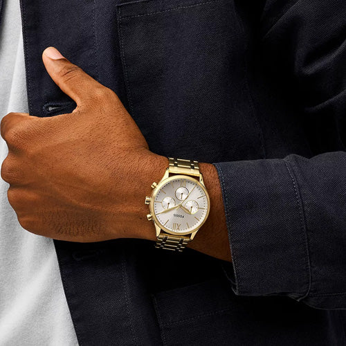 This gift set features 44mm and 36mm Fenmore watches, with matching silver sunray dials, multifunction movement and gold-tone stainless steel bracelets.