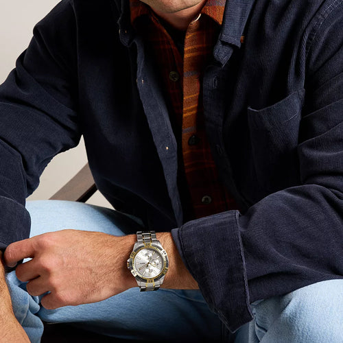 Garrett is an oversized watch with classic sport styling. The two-tone stainless steel bracelet combines silver-tone and gold-tone finishes for a refined contrast, complementing the matching case. A rich silver sunray dial creates depth, and multifunction sub-dials add practical detail. Thoughtfully crafted with quality materials, this watch emphasizes both design and everyday wearability.