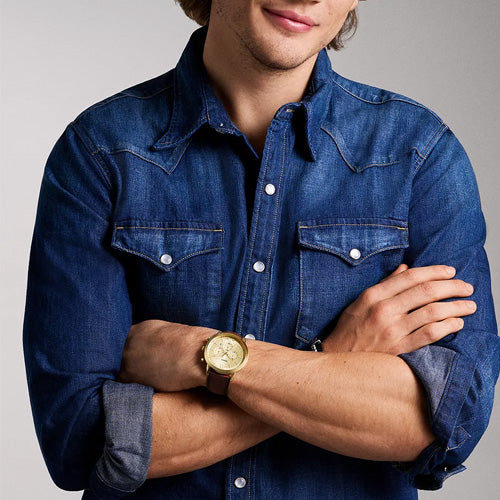 Incorporating elements from Mid-Century architecture, this chronograph features a well-balanced construction, decorated with a minimal champagne sunray dial and sculpted gold-tone stainless steel case. A domed mineral crystal and precise Japanese movement lend this standout timepiece both precision and iconic style.