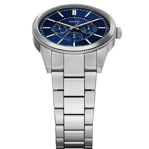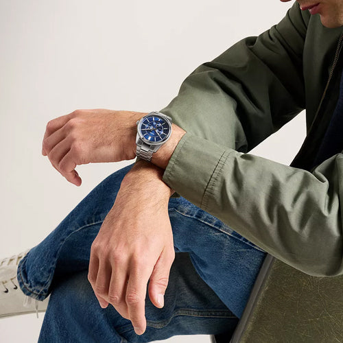 A stainless steel bracelet and matching case create a sleek foundation for this watch's design. The blue sunray dial adds texture and depth, complemented by practical sub-dials for day, date, and 24-hour functionality. Thoughtfully constructed with polished materials and a versatile round case, this piece balances refined details with everyday practicality.