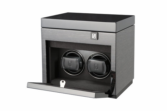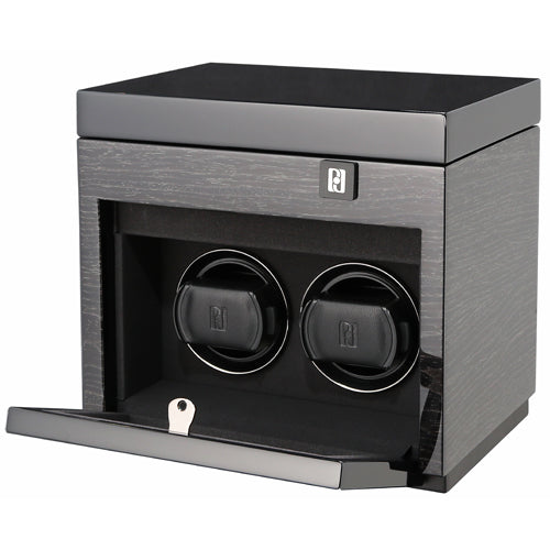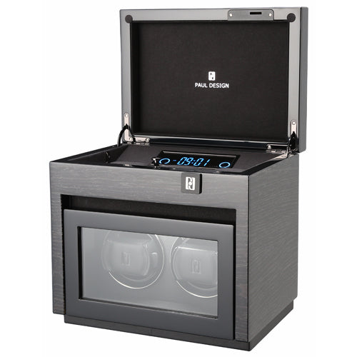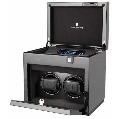 Paul Design, Watch winder for 2 watches and storage for 3 watches, Generous storage space in the lockable lid for an additional 3 watches, Black velour watch cushion, Sophisticated technology and operation via an easy to use push button, Each watch can be controlled individually, Chrome plated metal rings, Velour watch holder, Interior: finest black velour.