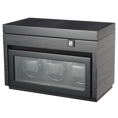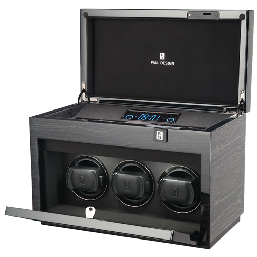Paul Design, This bestseller moves 3 watches, Generous storage space in the lockable lid for an additional 5 watches, Black velour watch cushion, Sophisticated technology and operation via an easy to use push button, Each watch can be controlled individually, Chrome plated metal rings, Watch holder in black PU leather, Interior: finest black velour,