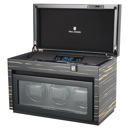 Paul Design, Gentlemen3+5 Black Shadow, This bestselling watch winder has room for 3 watches and the lockable lid offers space for an additional 5 watches. The watch winder’s lovingly crafted wooden case is finished with 5 layers of high-gloss varnish. The ingenious technology and the simple operation by means of a push button will convince every watch collector.