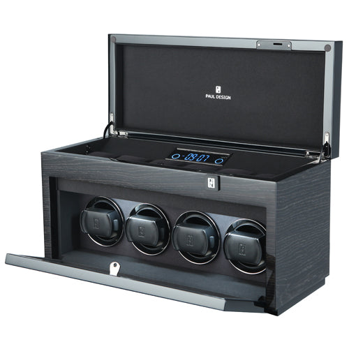 Paul Design, This watch winder moves 4 watches, Generous storage space in the lockable lid for an additional 6 watches, Black velour watch cushion, Sophisticated technology and operation via an easy to use push button, Each watch can be controlled individually, Chrome plated metal rings, Watch holder in PU leather black, Interior: finest black velour