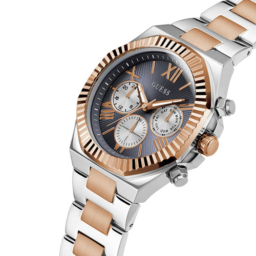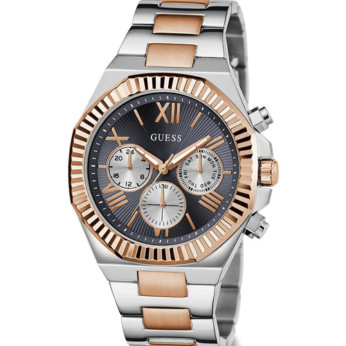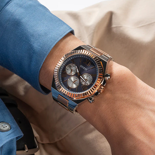Created for the man who knows what success looks like — and isn’t afraid to show it. Command attention with this style from our Equity Collection. This two tone multi-function watch features an oversized 44 mm polished round recycled steel case with a distinguished coin edge bezel and chrono-look navy sunray multi-function dial. The brushed/polished 3-link bracelet with pilot buckle closure offers the perfect blend of luxury and practicality with mineral lens protection and 50 meters water resistance.