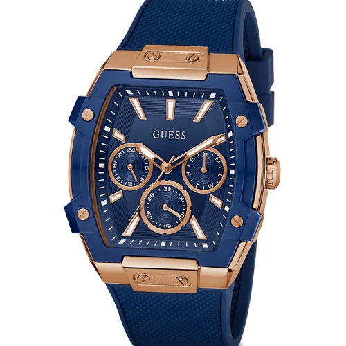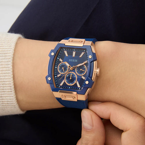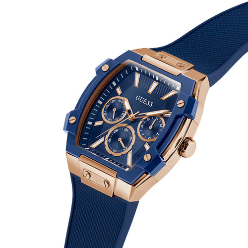 Unleash your edge with this powerhouse piece featuring innovative new nylon details and bold contemporary design in a 51 mm x 44 mm rectangular case. A polished rose gold tone recycled steel case meets a blue bio-based nylon overlay and is paired with a textured blue silicone strap. The blue sunray dial offers multi-function capabilities, and with 50 meters water resistance, this forward-thinking timepiece is perfect for the man who demands both innovation and performance in his accessories.