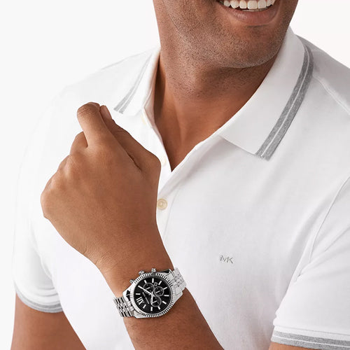 This Michael Kors Lexington watch features a black sunray chronograph dial, a textured stainless-steel case and is complete with a 5-link stainless-steel bracelet.