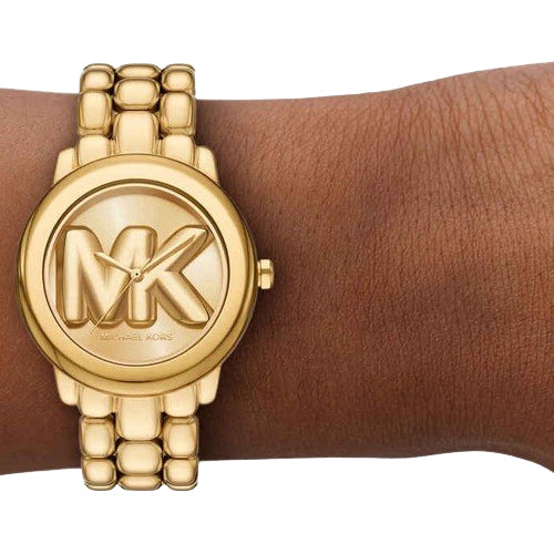 Refined and sculptural, the Phoebe watch showcases our new MK Pop Charm on the dial. Crafted from gold-tone stainless steel, it features a distinctive puffy chain-link bracelet with a radiant finish that catches the light. Style it as a statement piece for both workday ensembles and evening occasions.