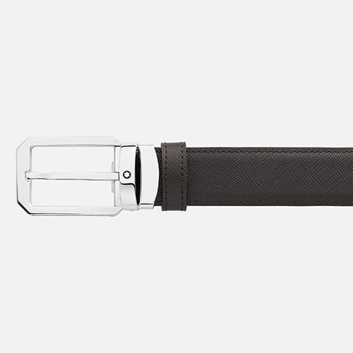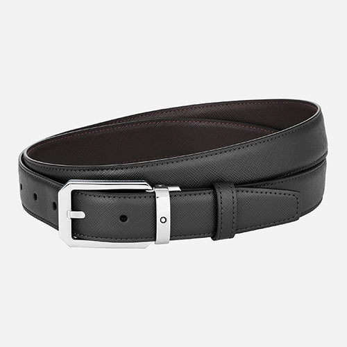 Trapeze shiny palladium-finish pin buckle with leather detail. Self-adjustable, 3 cm x 120 cm, reversible saffiano printed leather strap in black and brown. Conceived for a classic look with a twist.