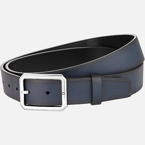 Octagonal frame shiny palladium-finish pin buckle. Self-adjustable, 3.5 cm x 120 cm, reversible strap in shaded blue grainy leather on one side and black plain leather on the other. Conceived for a sophisticated look.