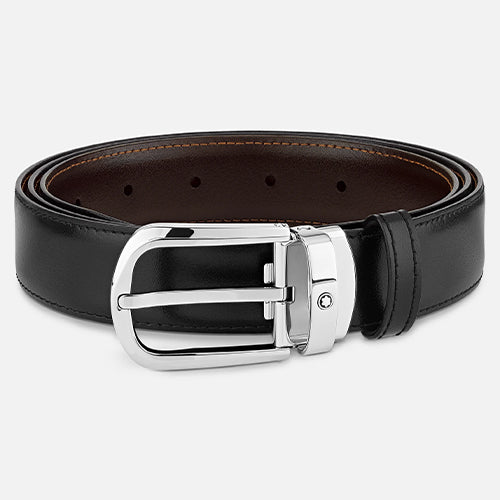 Curved Horseshoe Shiny Stainless Steel Pin Buckle. Self-adjustable, 3 cm x 120 cm, reversible black and brown leather strap.