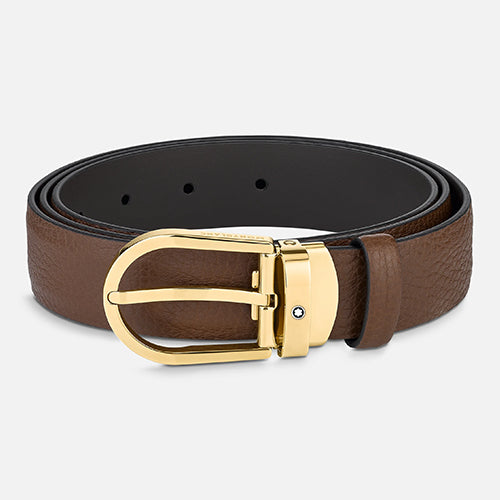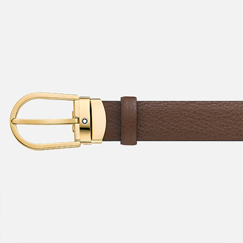 Horseshoe stainless steel shiny light gold PVD finish pin buckle. Self-adjustable, 3 cm x 120 cm, strap in brown grainy leather. A timeless model for men seeking for an understated look.