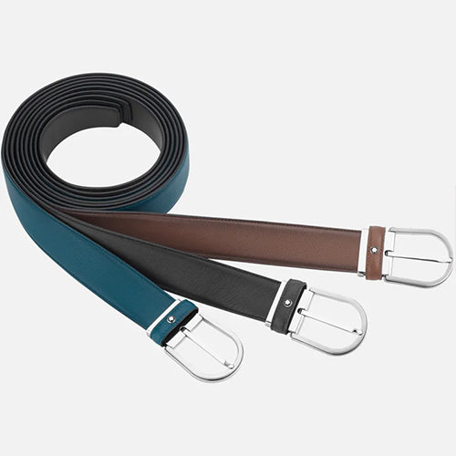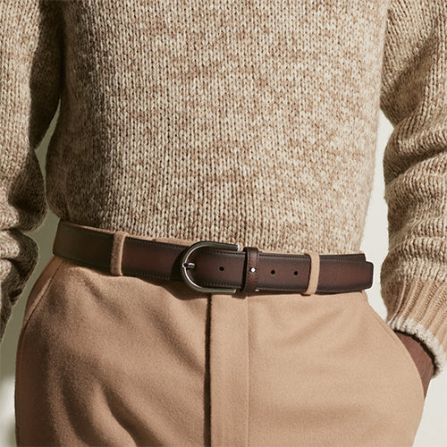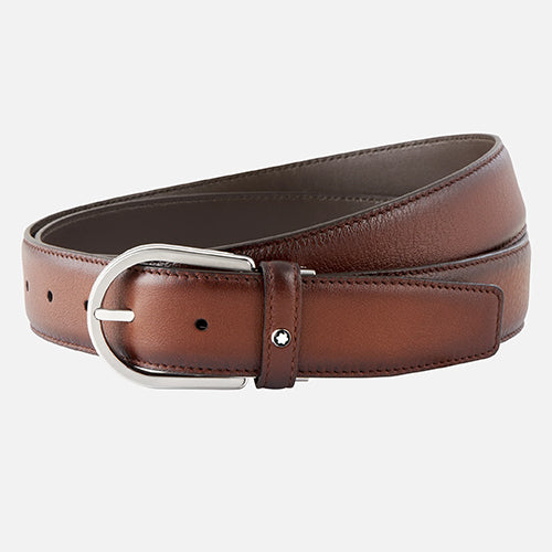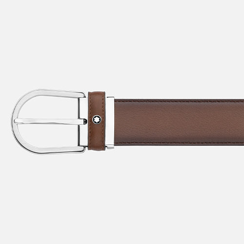 Horseshoe shiny & matte stainless steel pin buckle. Self-adjustable, 3.5 cm x 120 cm, brown plain leather strap featuring the unique patina of hand-painted leather with a delicate gradation of colors.