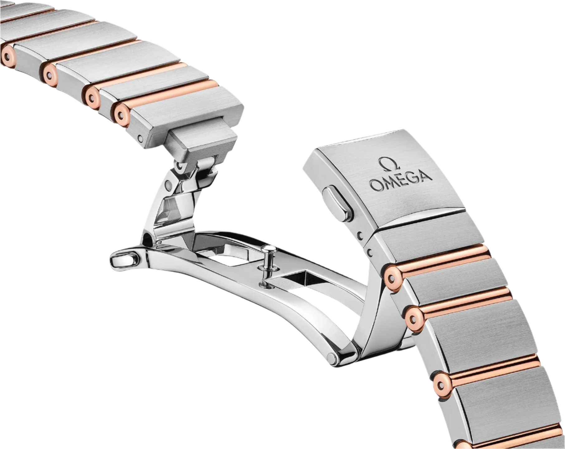 The 28 mm watch is presented with a case and mono-rang bracelet created from stainless steel and 18K Sedna™ Gold, with signature Constellation features including the polished claws, half-moon facets, and a diamond-paved bezel.