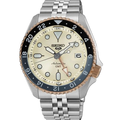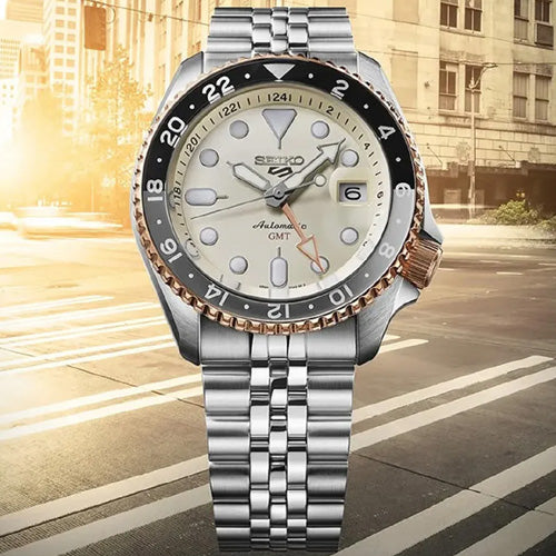 SSK046K1 SKX GMT series Asia limited edition, inspired by the beautiful light seen at sunrise. The watch captures the serene beauty of sunrise with its elegant off-white dial, like the soft glow of early morning light. In order to present a sense of tranquility at dawn, rose gold is introduced for the first time in the SKX GMT series on the sides of the rotating bezel and the GMT hands. The five-row chain is also inspired by the original SKX series. The middle section is polished, which contrasts sharply with the hairline pattern of other sections. This watch is only available in Asia, with a limited edition of 5,500 pieces and a limited serial number on the back of the watch.