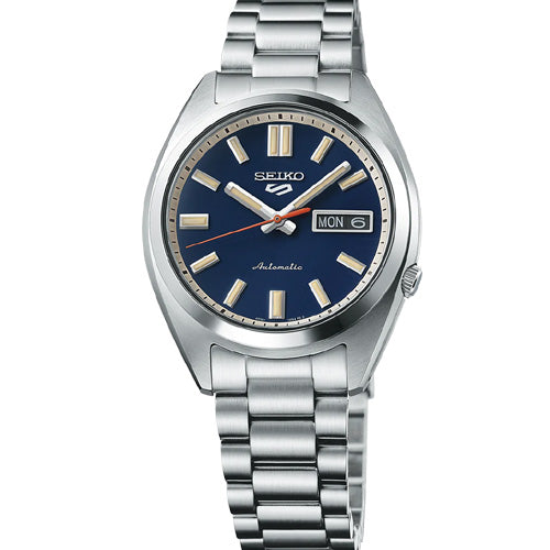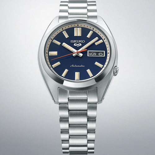 Continuing the evolution of our long-standing Seiko 5 Sports SNXS series, this new watch adopts the design principles of the originals. Built to fit the theme of ‘classic sports’ this watch takes the essence of the 70s Seiko 5 Sports models and integrates them with modern specifications. Under a semi-spherical glass, the dial features Lumibrite glow-in-the-dark hands and indices, each diamond-cut with finely grooved lines, on a ‘rinse blue’ dark dial. The hands are non-triangular and are wider, to enhance the vintage retro look whilst the orange second hand is inspired by the classic 70s design. With a metal dial ring, the bracelet features striking mirror and hairline finishing. This piece is powered by an in-house 4R36 automatic movement, which is accurate to +45 / -35 seconds per day, and has a 40-hour power reserve. Seiko 5 Sports is known for over fifty years of reliability, durability, performance, and value. ‘’5’’ represents the original five key features of every Seiko 5 still present today: Automatic movement, Day-date display, Water Resistance, Recessed crown and Durable case and bracelet.