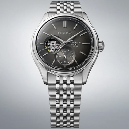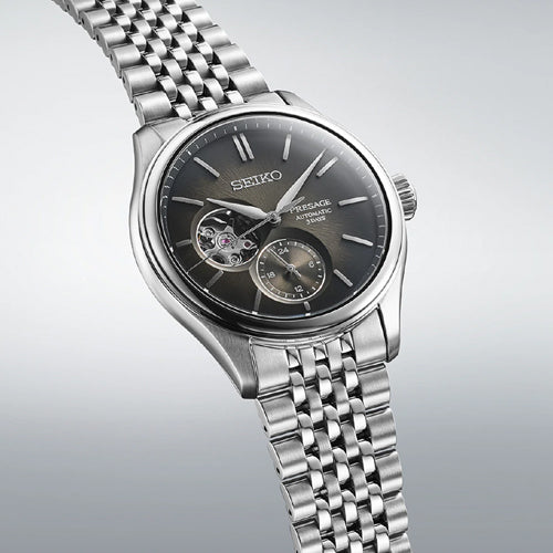 Introducing the Presage Classic Series – watches designed with inherent Japanese elegance. Named ‘Sumi-iro’ meaning ‘ink black’ for the colour of its dial, the dial texture is inspired by soft Japanese silk – a material which has long featured in Japan’s history since ancient times in home décor and clothing. Under sapphire glass, the curved dial with curved hands and indices evoke vintage style and are specifically designed to maximise light reflections. The recessed ‘open-heart’ feature at 9 o’clock, shows the inner beauty of the 6R5J movement within which powers the watch. It also features a recessed 24-hour subdial at 6 o’clock. The seven-piece multi-row bracelet has been developed and inspired by 1970s retro-style metal watch bracelets. Not only are these designed for style and to reflect the light, each piece is short at only 6mm long, allowing for maximum movement and comfort. This Classic Series timepiece is powered by an in-house 6R5J calibre, accurate to -15/+25 seconds per day, with a three-day 72-hour power reserve. Seiko Presage: Timeless looks, precise mechanical timekeeping. Minimalistic watch designs with a distinctly Japanese aesthetic.