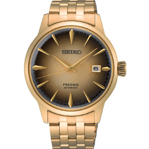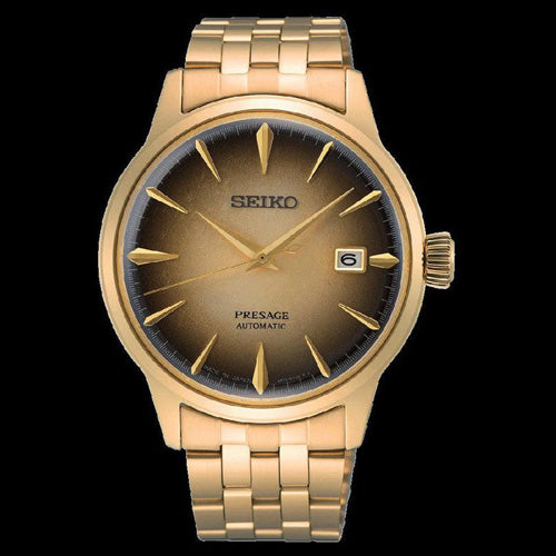 Traditionally in Japan ‘Nomunication hour’ – a hybrid of nomu (drink) and communication, is after 5pm – when it’s cocktail hour and time to talk things over. The Seiko Presage Cocktail Time collection was inspired by this Japanese custom – with each timepiece named after drinks mixed by Hisashi Kishi, head bartender of Star Bar in Tokyo’s Ginza area. With a dial designed to resemble the view of the drink through a glass, this timepiece is inspired by a “half and half” cocktail. Mr Kishi mixes Japanese ale and stout, to create a golden creamy classic – the dial of this piece captures the full-bodied, rich, smooth flavours. A striking gold-coloured case and bracelet match its warm-toned dial whilst golden indices are complemented by dauphine hands and a date function at 3 o’clock. It has a three-fold clasp with a push button release, as well as a see-through exhibition case back.