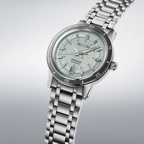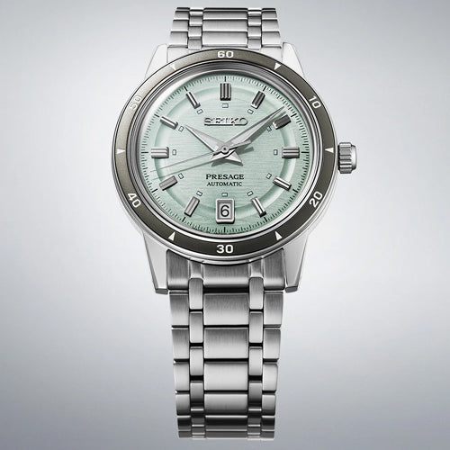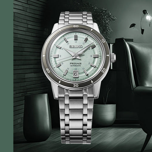 This Presage Style 60s takes inspiration from the iconic colour palettes of the swinging sixties, popular in the heyday of mid-century modern design. The classic Style 60s case design is inspired by the Seiko Crown Chronograph from 1964 – the first chronograph made in Japan, crafted especially for the Tokyo Olympics when Seiko first became official timekeepers. Accompanying the aluminium bezel is an ice green dial that features a raised circle effect for a futuristic style loved in the 1960s. It is powered by an in-house built 4R35 automatic calibre, accurate to +45 / -35 seconds per day with a 40-hour power reserve. Seiko Presage: Timeless looks, precise mechanical timekeeping. Minimalistic watch designs with a distinctly Japanese aesthetic.