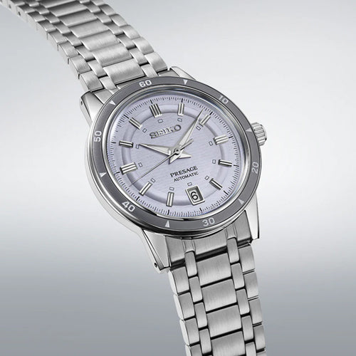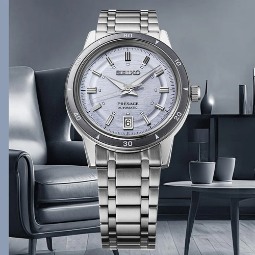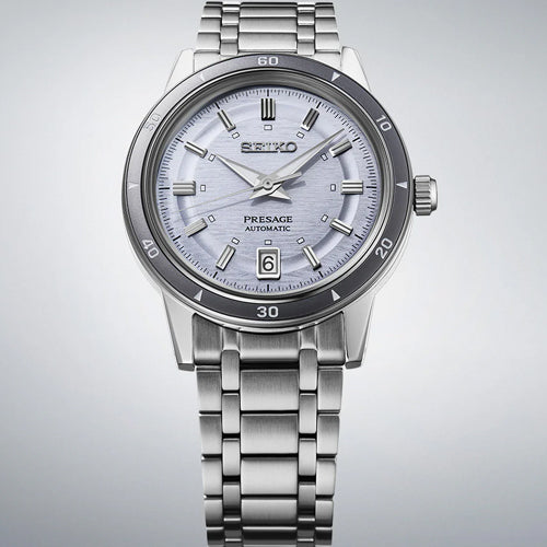 This Presage Style 60s takes inspiration from the iconic colour palettes of the swinging sixties, popular in the heyday of mid-century modern design. The classic Style 60s case design is inspired by the Seiko Crown Chronograph from 1964 – the first chronograph made in Japan, crafted especially for the Tokyo Olympics when Seiko first became official timekeepers. Accompanying the aluminium bezel is a silvery violet dial that features a raised circle effect for a futuristic style loved in the 1960s. The bracelet links are hairline finished for an elegant touch and to bring out the pastel colour of the dial. It is powered by an in-house built 4R35 automatic calibre, accurate to +45 / -35 seconds per day with a 40-hour power reserve. Seiko Presage: Timeless looks, precise mechanical timekeeping. Minimalistic watch designs with a distinctly Japanese aesthetic.