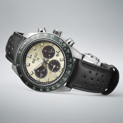 Introduced in 1969, the Seiko Speedtimer was a major milestone in chronograph innovation, and marked the beginning of an important decade of the Speedtimer in its prime. The 70s were famed for many things: fashion, music, but also motorsports. Designed under the theme of ‘Classic Motorsports,’ the ‘Racing Sports’ Speedtimer is inspired by the lightweight sports cars of the past. Encased in a classic dark green aluminium bezel and sapphire crystal glass, this chronograph features an ivory-coloured dial, with hour and minute hands that resemble the original Speedtimer from 1969. With 12 spots of Lumibrite, this timepiece is designed to be legible in darker conditions. With a chronograph second scale around the dial ring, this piece also features a Tachymeter on the bezel for measuring speed – an iconic element of the Seiko Speedtimer. This Solar Speedtimer comes with a black punched calf leather strap – a first for a Seiko Speedtimer. Featuring a solar-powered V192, this Speedtimer chronograph is accurate to +/- 15 seconds per month, whilst maintaining a full charge of 6 months. Prospex is a combination of the words ‘Professional’ and ‘Specifications.’ Seiko Prospex timepieces are designed to be practical, reliable and durable; to meet the high standards required in extreme environments for sports lovers and adventure seekers alike.