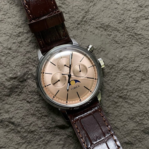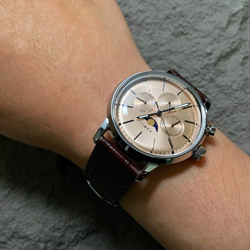 Our Marlin® Moon Phase Multifunction pays tribute to the great minds that propelled mankind to the moon with a sub-dial that faithfully mirrors the lunar cycle. This gorgeous rendition of our ‘60s Marlin features a sophisticated 40mm stainless-steel case and a calendar movement with sub-dials that indicate the day of the week, the month, and the date. The dial is complete with hand-applied indices and appears in timelessly rich colors, paired a traditional crocodile-patterned leather strap.