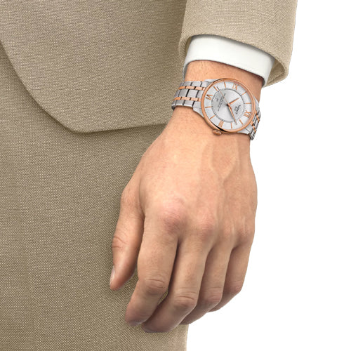 Close your eyes and think of a pure Swiss watch and you’ll see the Chemin des Tourelles. Named after the street that leads to Tissot's home in the Swiss mountains, it’s Tissot’s icon: round, classic, mechanical, ageless. Now updated and refined, this edition has a gently domed sapphire crystal that sits over a soft-sunray dial with simple, elegant baton hour markers, each faceted to catch the light in an understated but sophisticated way. And under that is the Nivachron Powermatic 80, a state-of-the art automatic mechanical movement with an 80-hour power reserve and elevated anti-magnetism. A watch for all time.